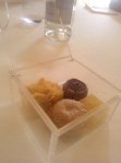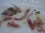 Cito qualche piatto: per antipasto mi sono orientata sul crudo e il cotto (2 portate tra crudo e cotto) ovvero tartare di tonno con uovo a bassa temperatura e mostarda, da lacrimare per l’emozione! Il carpaccio di pesce con semi di amaranto, mazzancolla con nocciola e gambero con granella di pistacchi; tempura di calamari, gamberi rossi e cipolle…una pastella leggerissima e una frittura altrettanto leggera e croccante, da vertigine! Parmigiana di mare: calamari shockati su una foglia di pomodoro, burrata e pappa al pomodoro; ravioli ripieni di maionese ai crostacei; gamberi rossi cotti per induzione su una mattonella di sale con erbe bruciate…divini! Come pre-dessert ricordo solo una deliziosa e delicata ricotta con melograno e fragola, ma dolci indimenticabili: bignè allo zabaione, ristretto al passito e meringa al caffè, variazione di fondente e riso al latte con caramello.