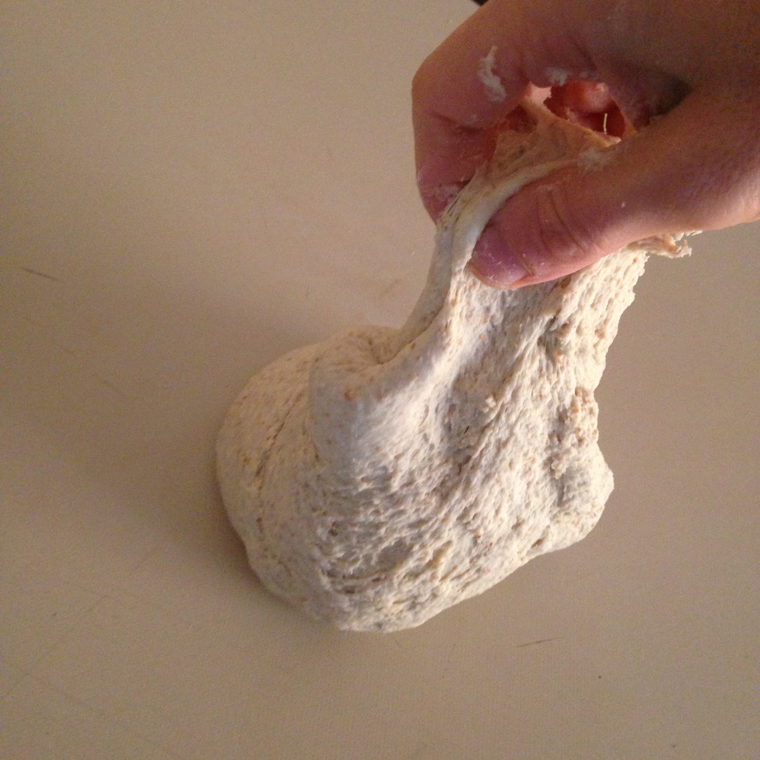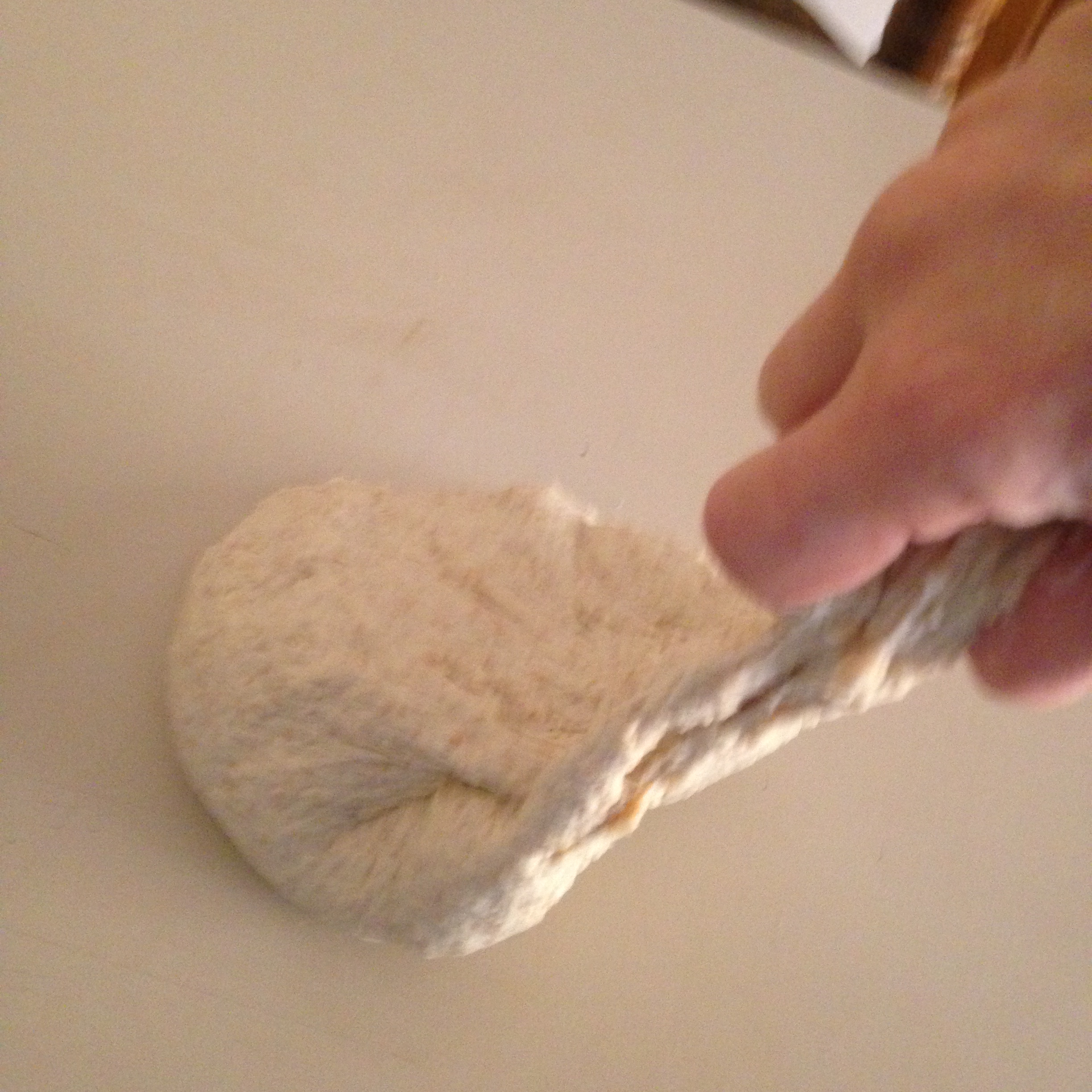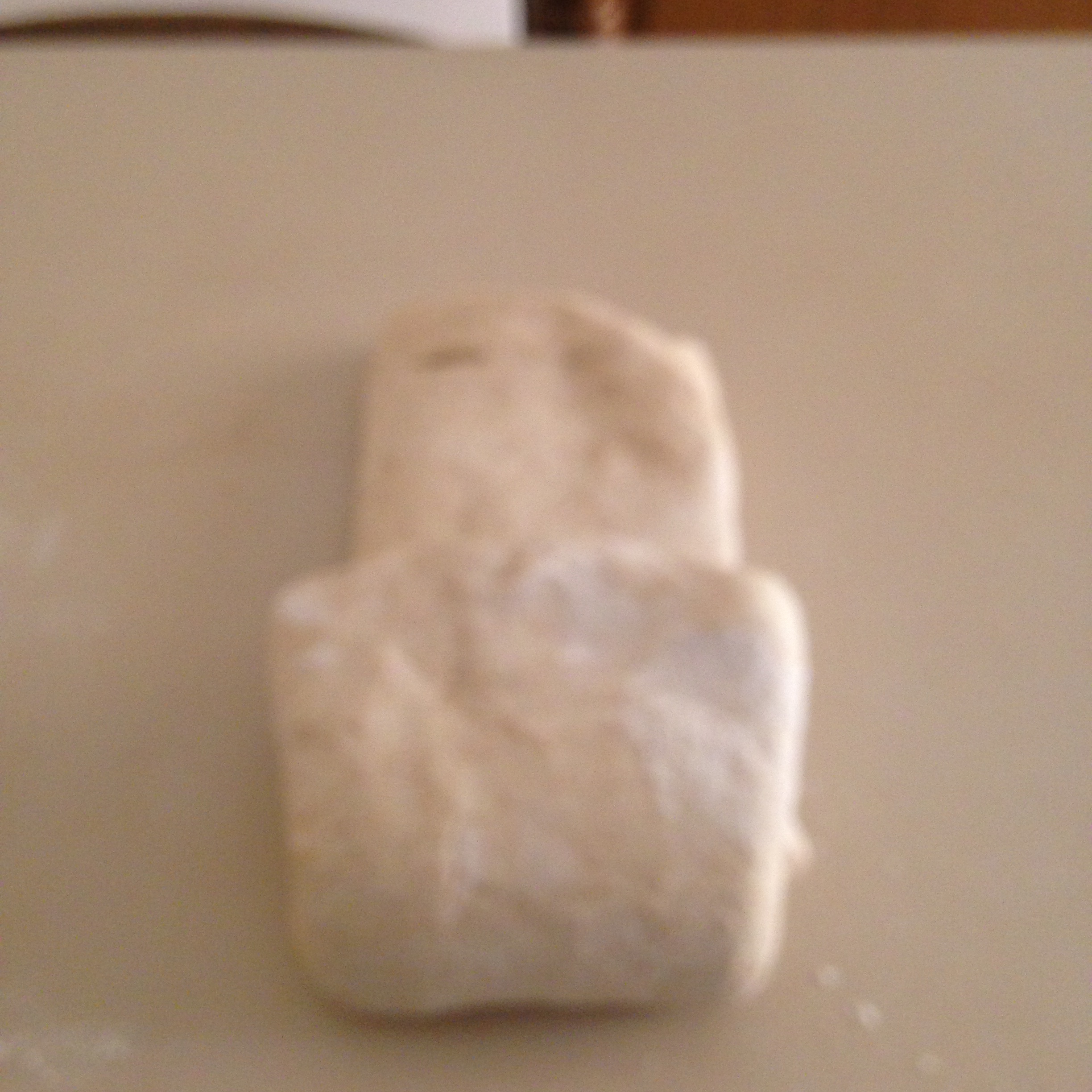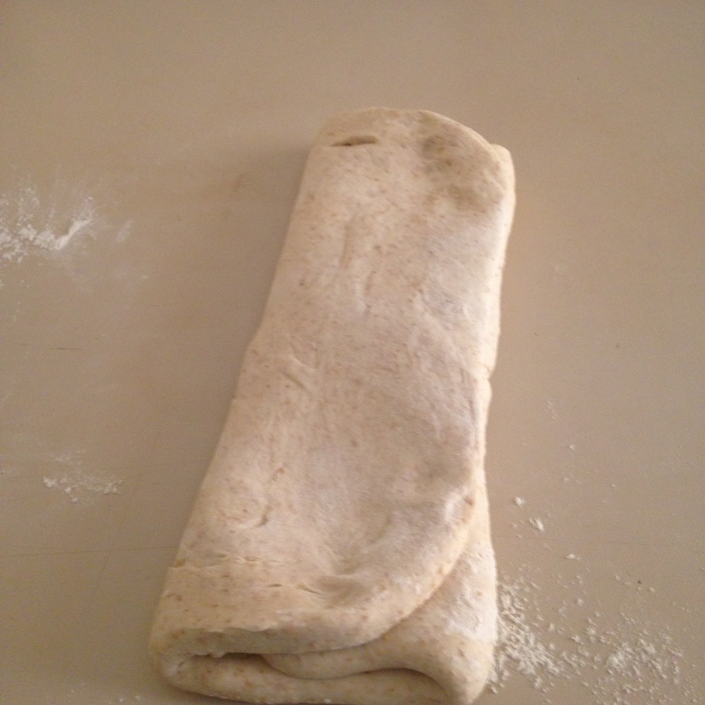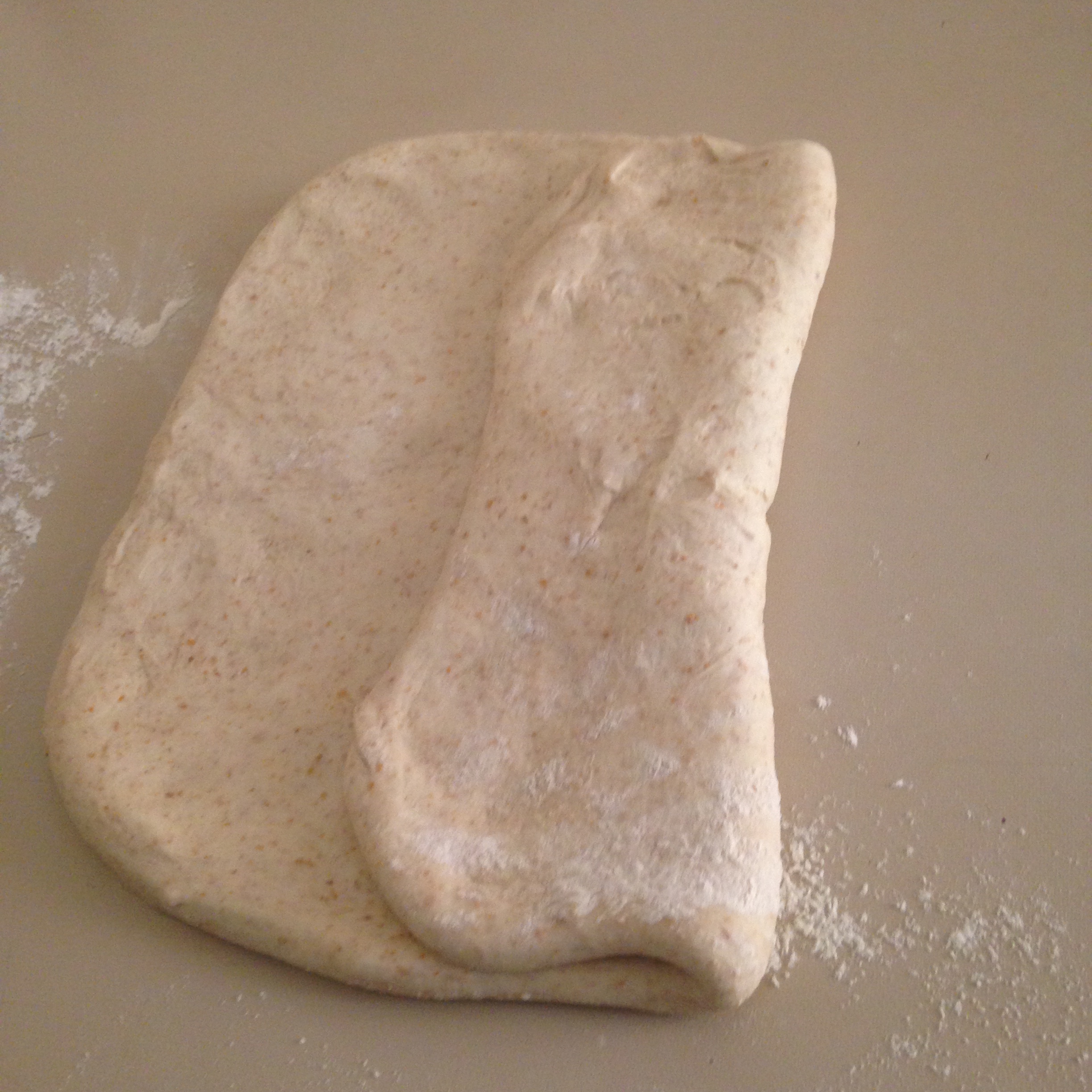 l’impasto con le mani per fare un rettangolo, piegare le due estremità verso il centro, ruotare di 90° e piegare le due estremità verso il centro. Ripetere questa operazione per altre 2 volte.