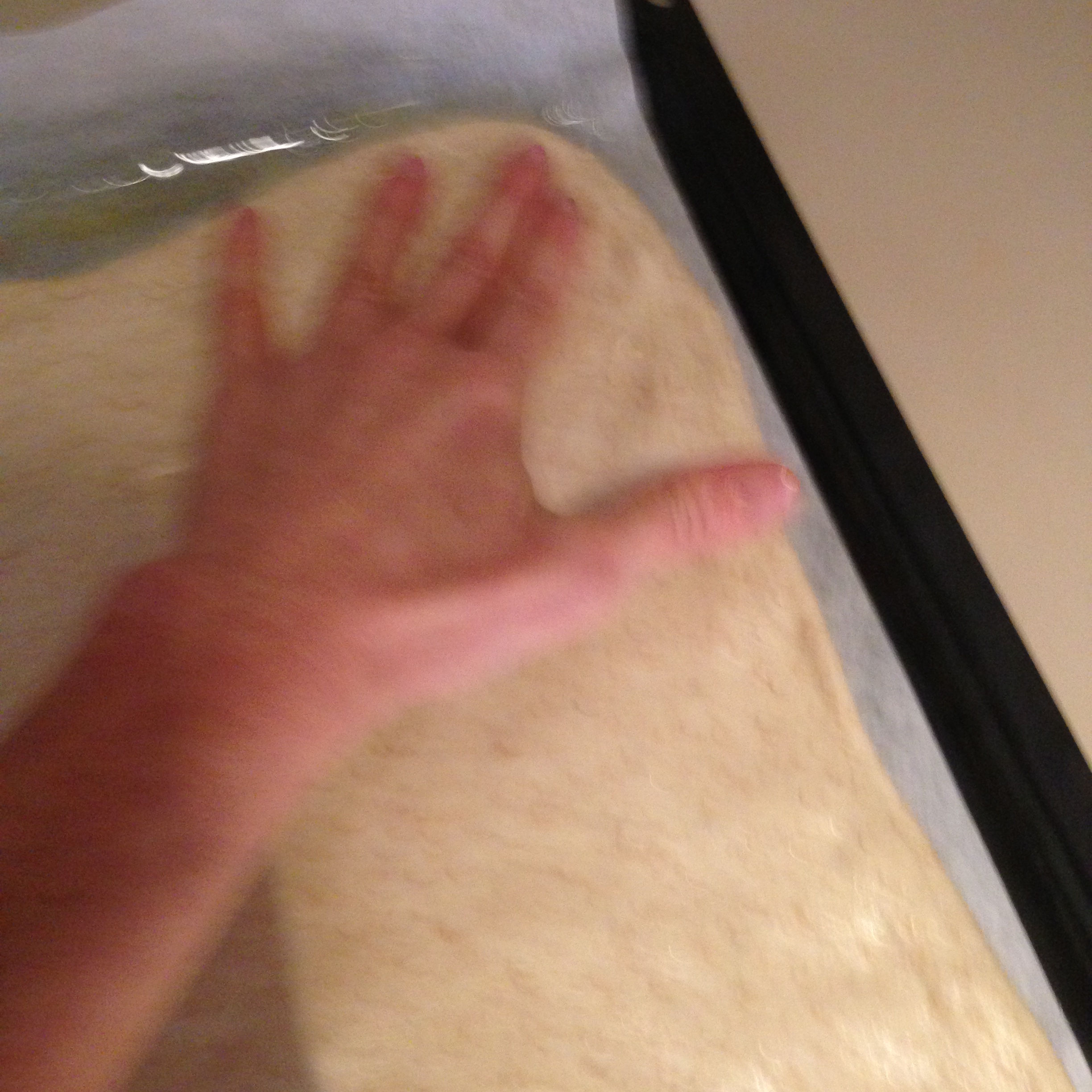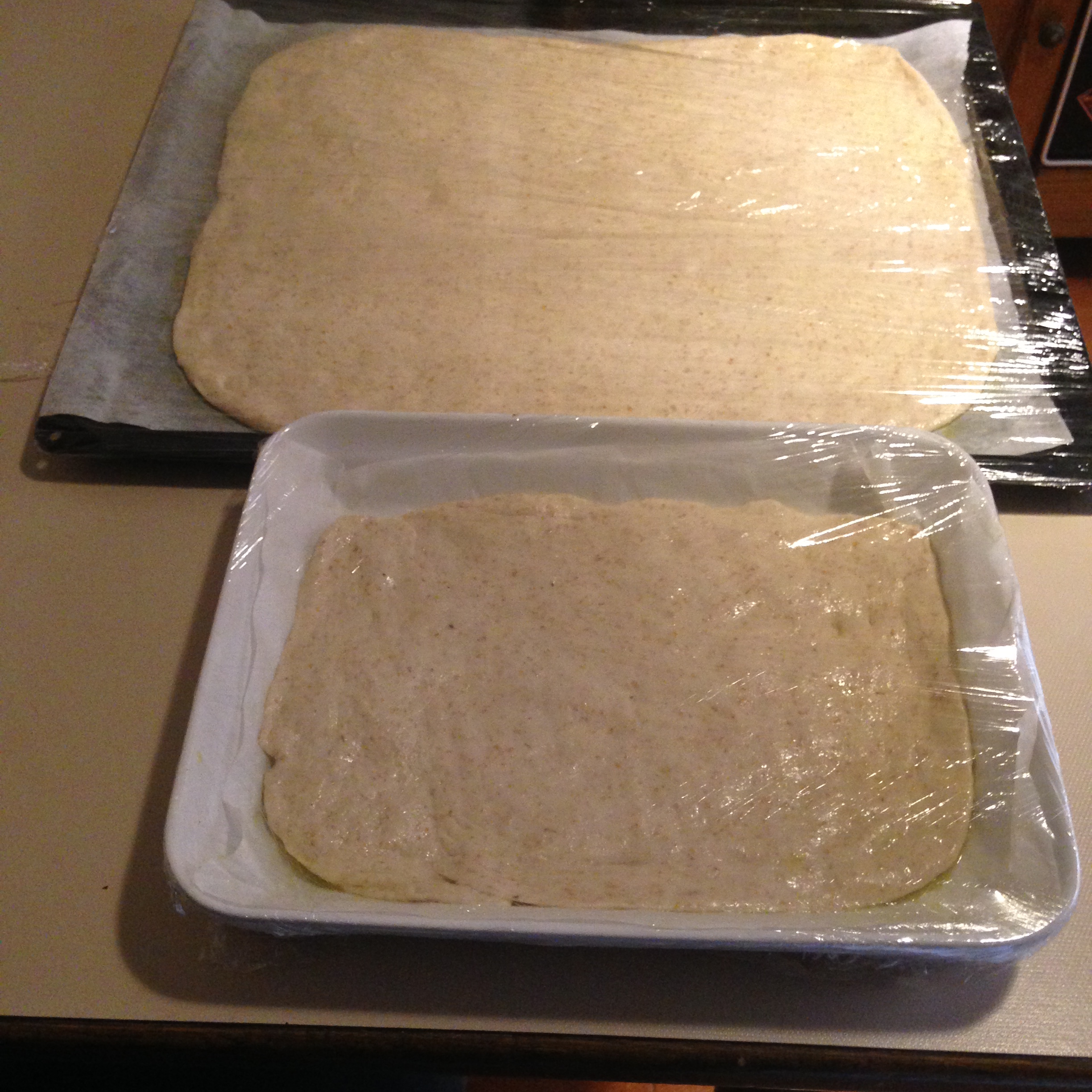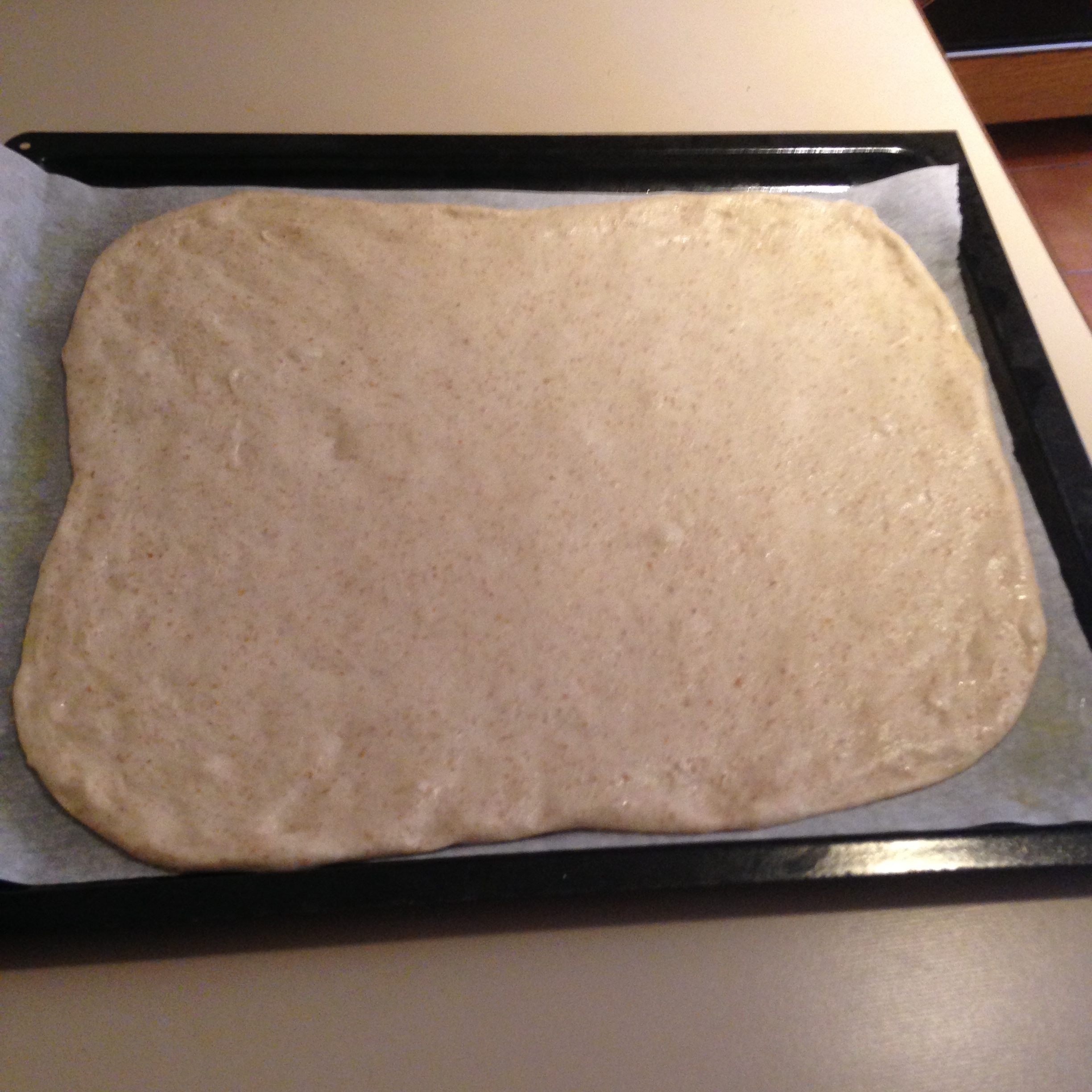 Rivestire la teglia con carta forno (dimensioni 40×33 se vi piace alta, io alle volte ne utilizzo anche un’altra più piccola) e ungerla con un filo di olio, trasferire l’impasto e con le mani stenderlo delicatamente sull’intera teglia e coprire con pellicola.
