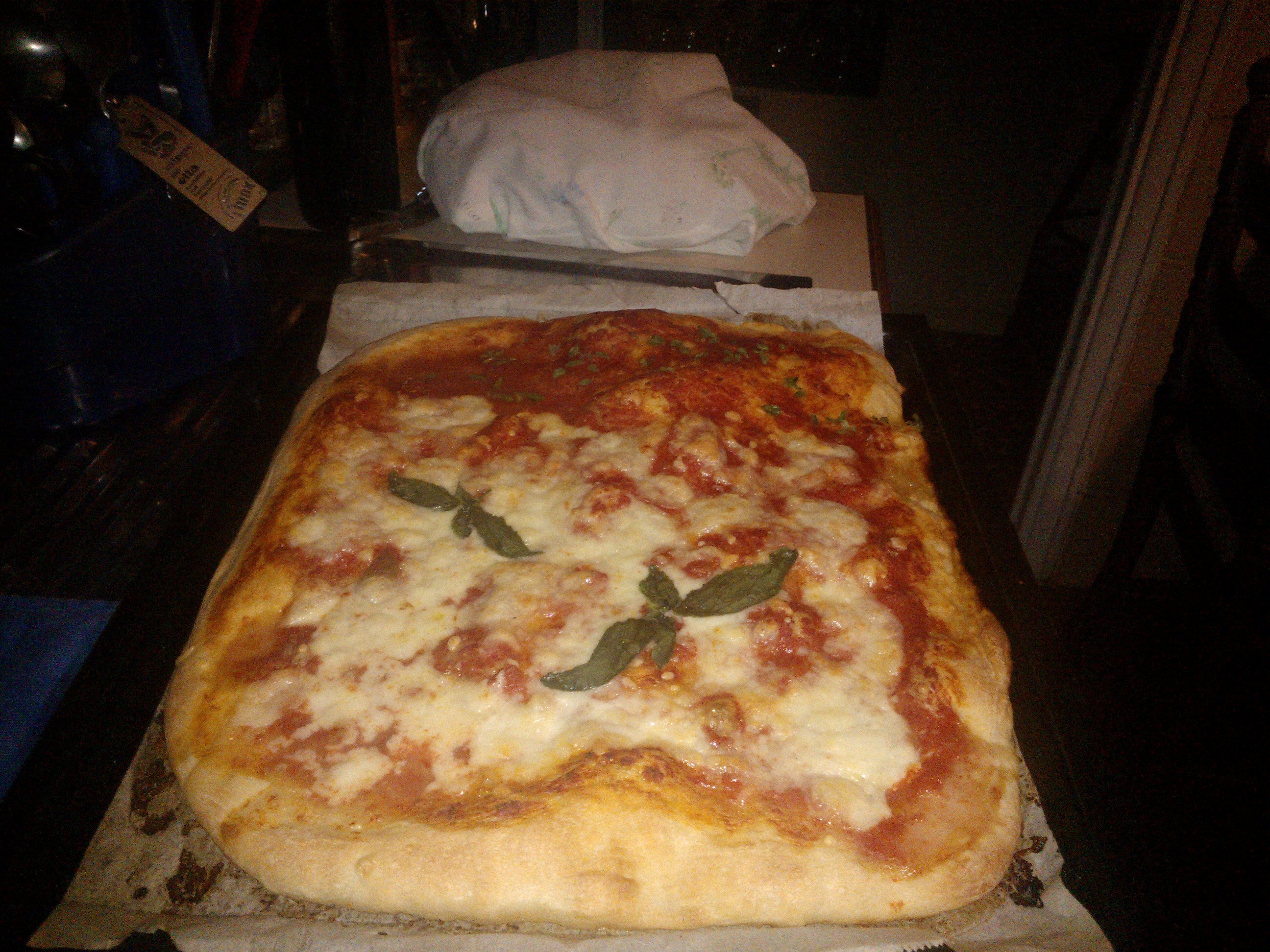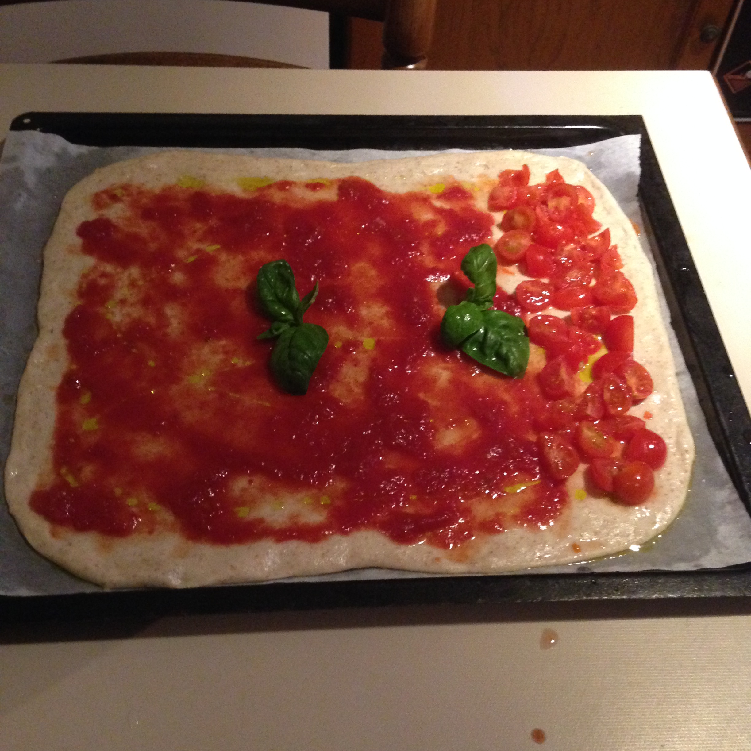 Far lievitare nuovamente per circa 1 ora o più. Scaldare il forno a più di 200 °C. Trascorso il tempo di lievitazione condire la pizza con pomodoro pelato, paasata di pomodoro o pomodorini freschi (la mozzarella va aggiunta a metà cottura della pizza) e un filo di olio su tutta la superficie (ovviamente ci si può sbizarrire con ogni tipo di verdura, provola affumicata, ecc).