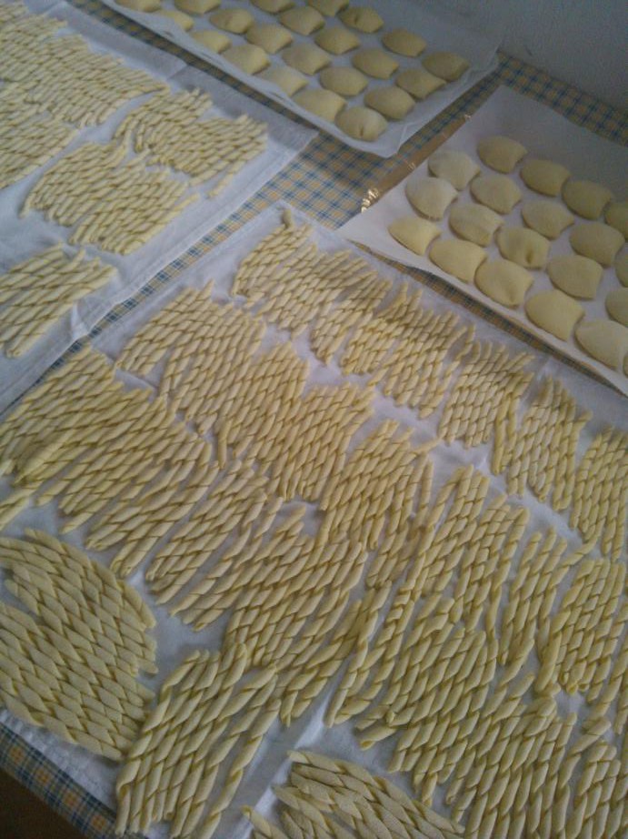 Tagliare la pasta a tocchetti (si lavora un po’ per volta in modo che non si asciughi troppo). A questo punto si può decidere il tipo di pasta da realizzare.