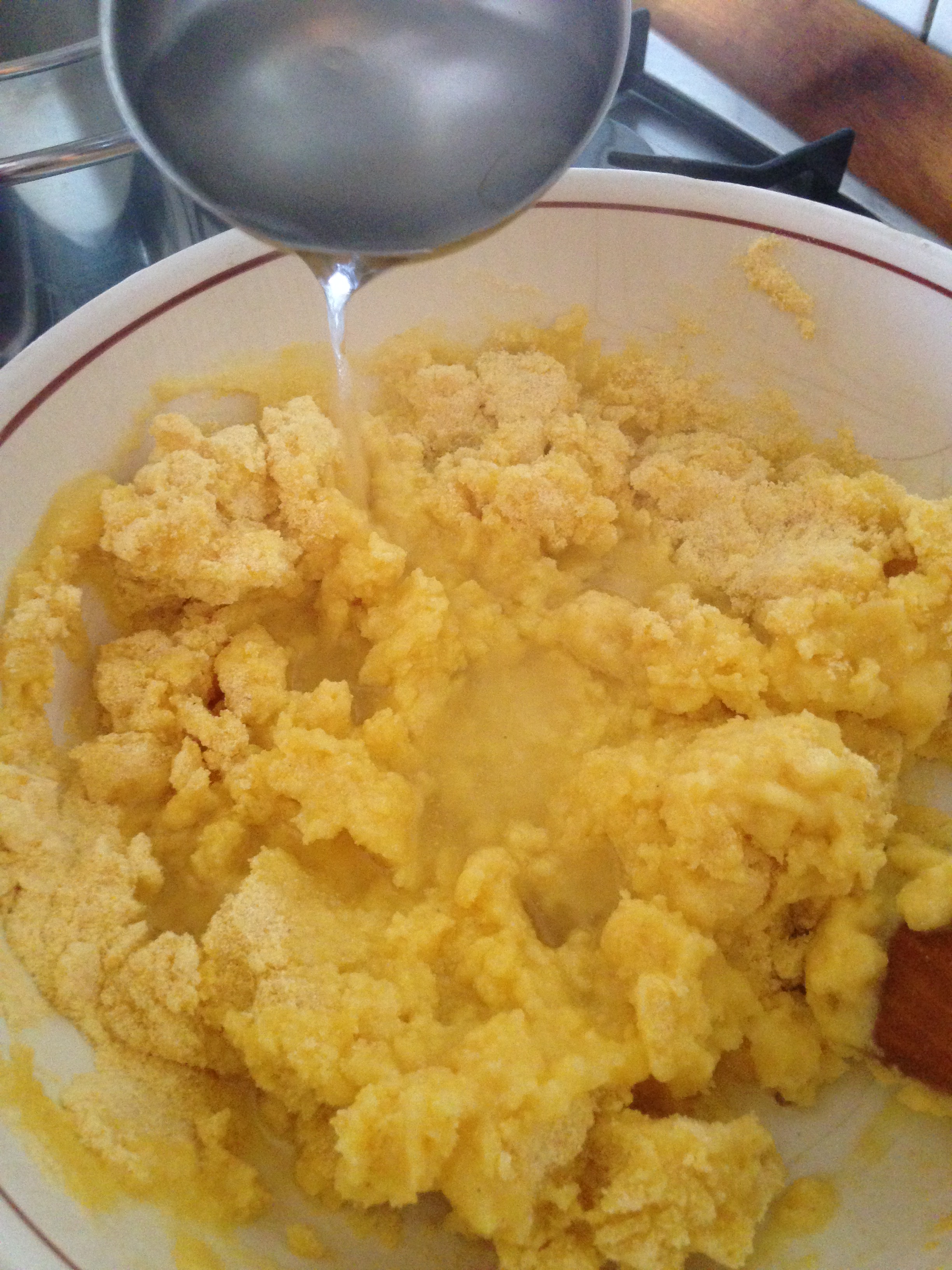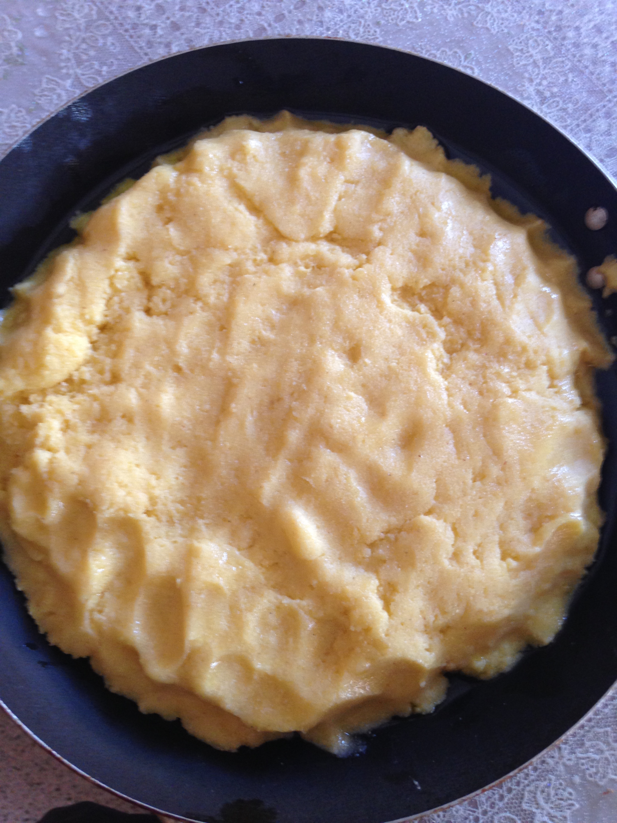 Far bollire dell’acqua salata quindi impastare la farina con l’acqua bollente e un cucchiaio d’olio fino ad ottenere una consistenza liscia e non troppo molle. Stendere l’impasto in una padella precedentemente oleata aiutandosi con le mani umide