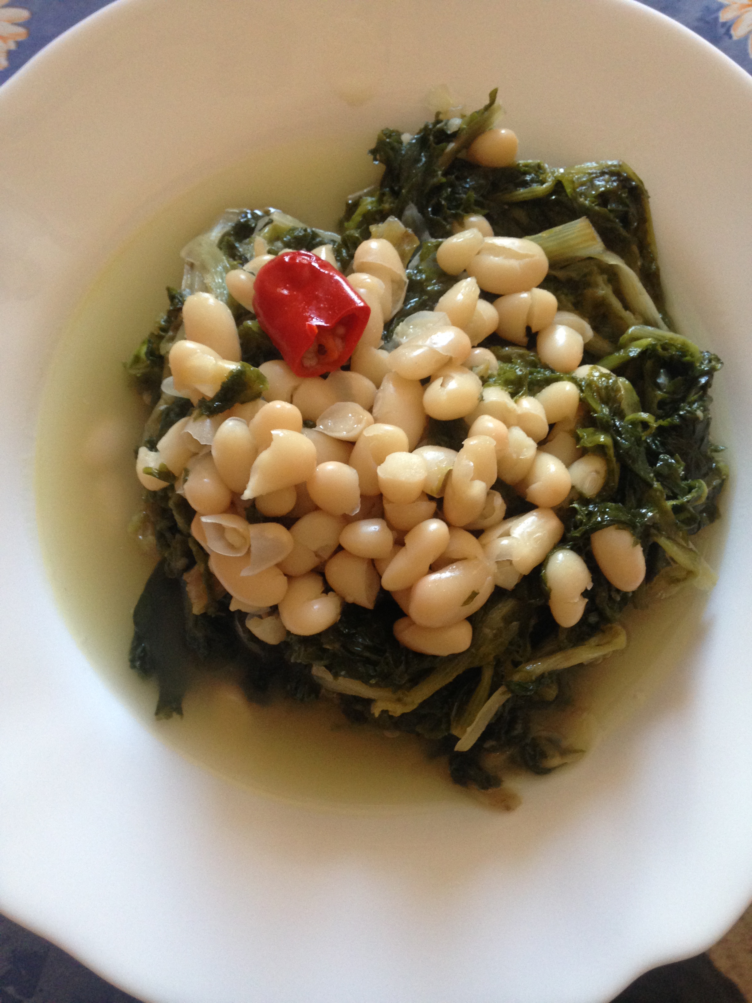 Mettere i fagioli a bagno per almeno 24h e cuocere, infine aggiungere il sale. La verdura va invece cotta in acqua bollente salata e poi ripassata con olio, aglio, perperoncino (o peperone crusco). Infine si uniscono i fagioli.